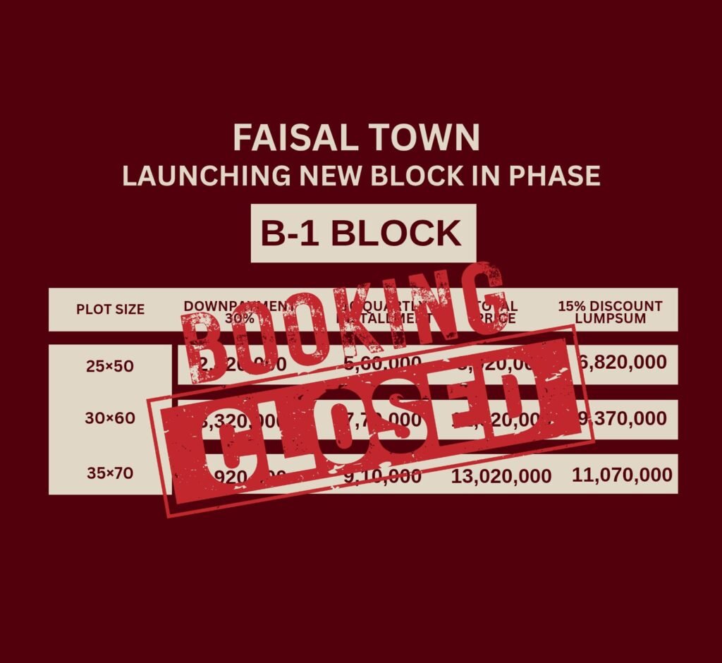 The booking phase for the B-1 Block in Faisal Town has now officially reached full capacity and is closed. Due to the overwhelming response and the high demand for these premium plot sizes—including our $25 \times 50$, $30 \times 60$, and $35 \times 70$ categories—all available inventory has been successfully secured by investors and future homeowners. We extend our sincere gratitude to everyone who participated in this launch. While direct bookings are currently unavailable, we invite you to stay tuned to our website for upcoming announcements regarding resale opportunities or the launch of future phases. Our team remains dedicated to providing exceptional real estate opportunities, and we look forward to welcoming you into our growing community soon.